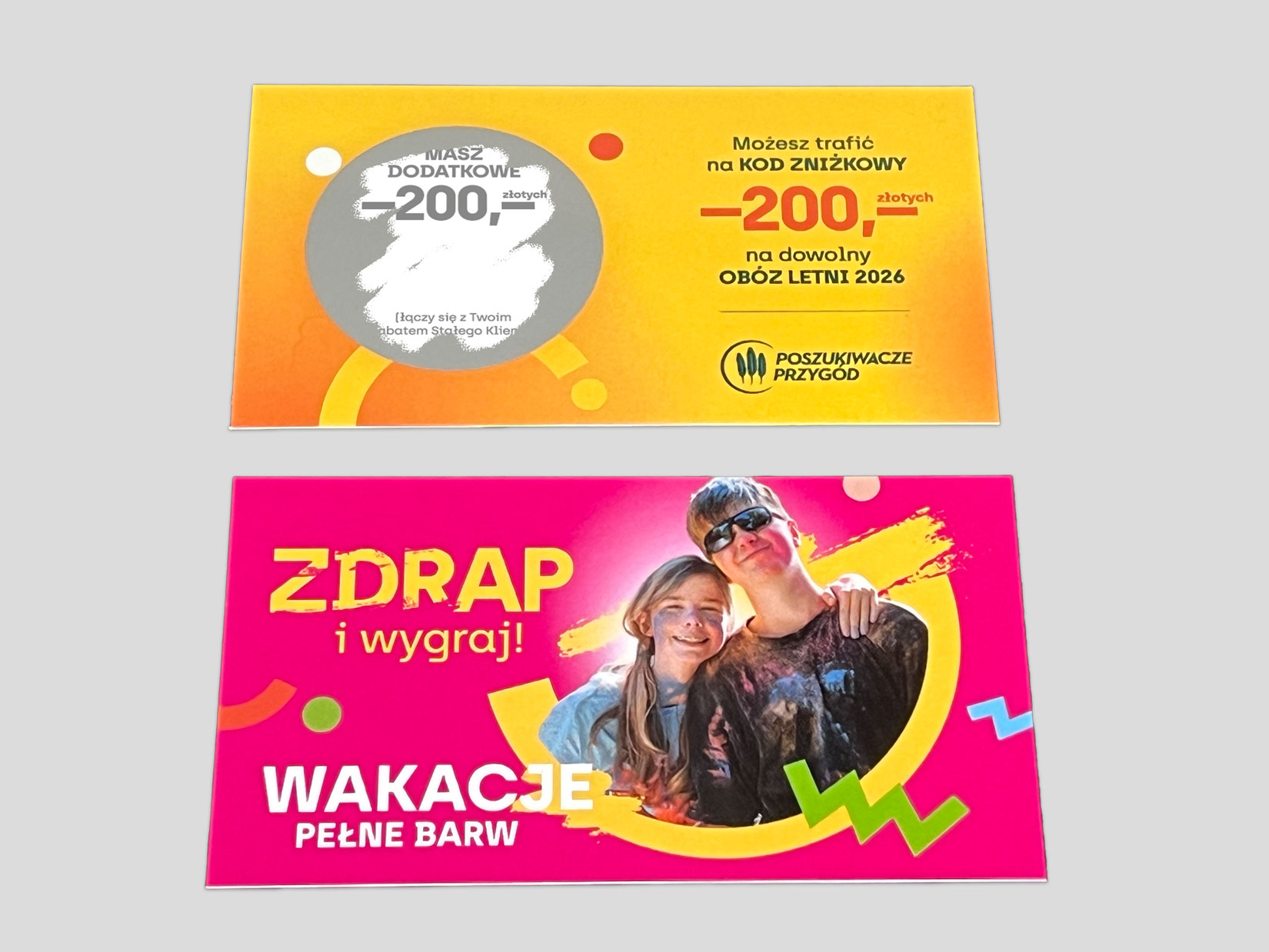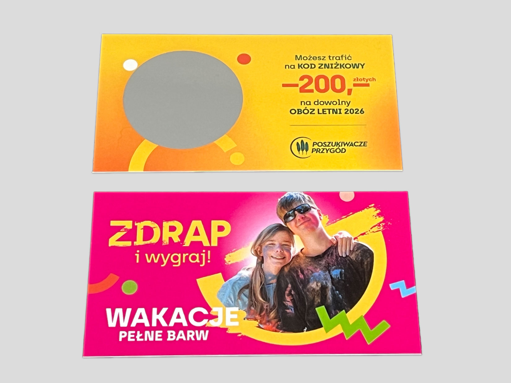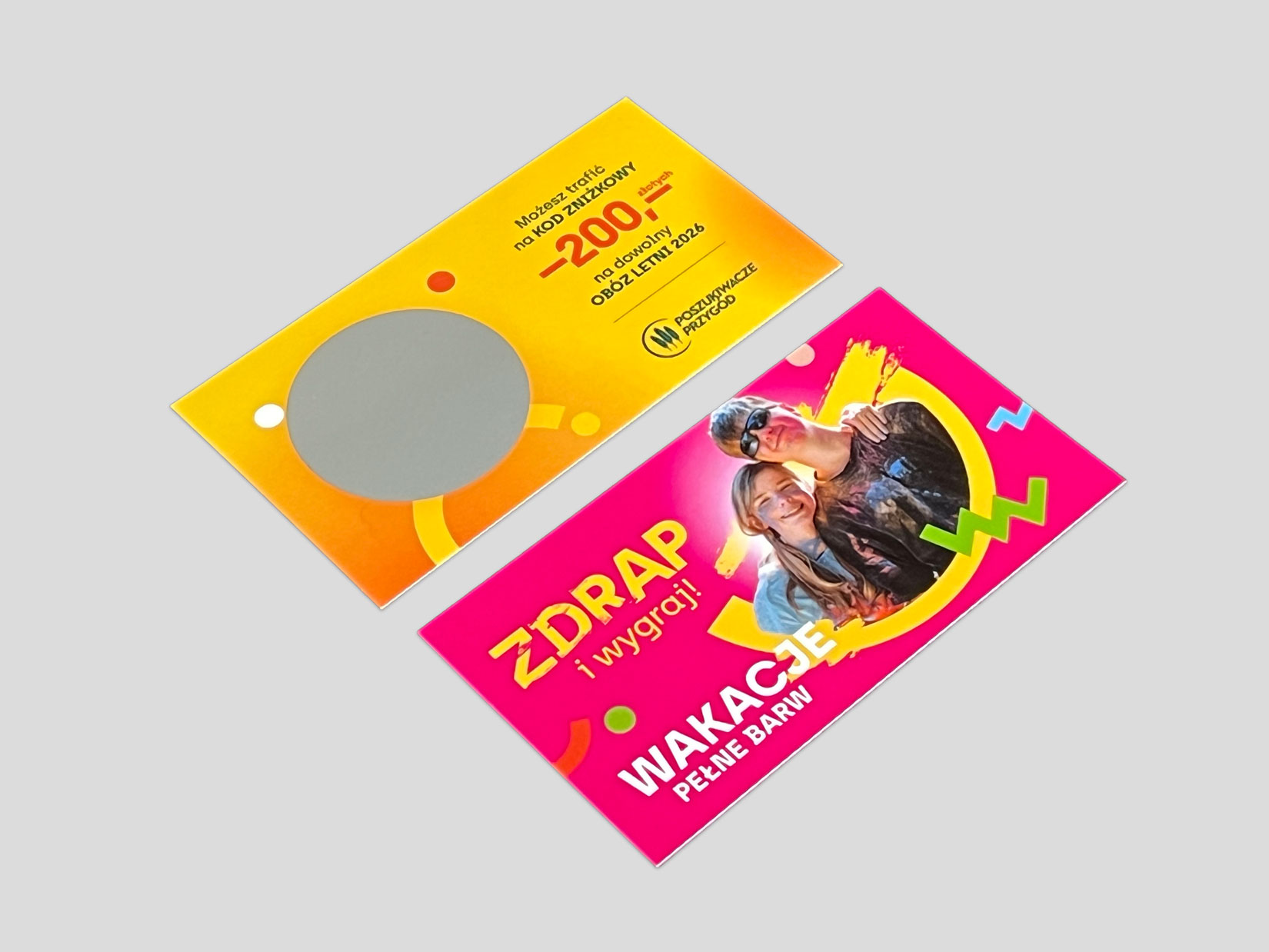Dla firmy Poszukiwacze Przygód przygotowaliśmy zdrapki promujące sprzedaż obozów letnich. Mechanizm był prosty i skuteczny - odbiorca zdrapuje pole i sprawdza, czy wygrał dodatkowy rabat na wyjazd. Taka forma komunikacji natychmiast angażuje, przyciąga uwagę i zwiększa zainteresowanie ofertą.